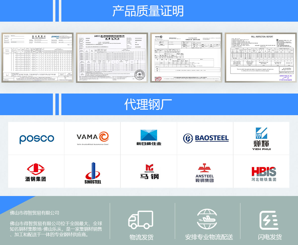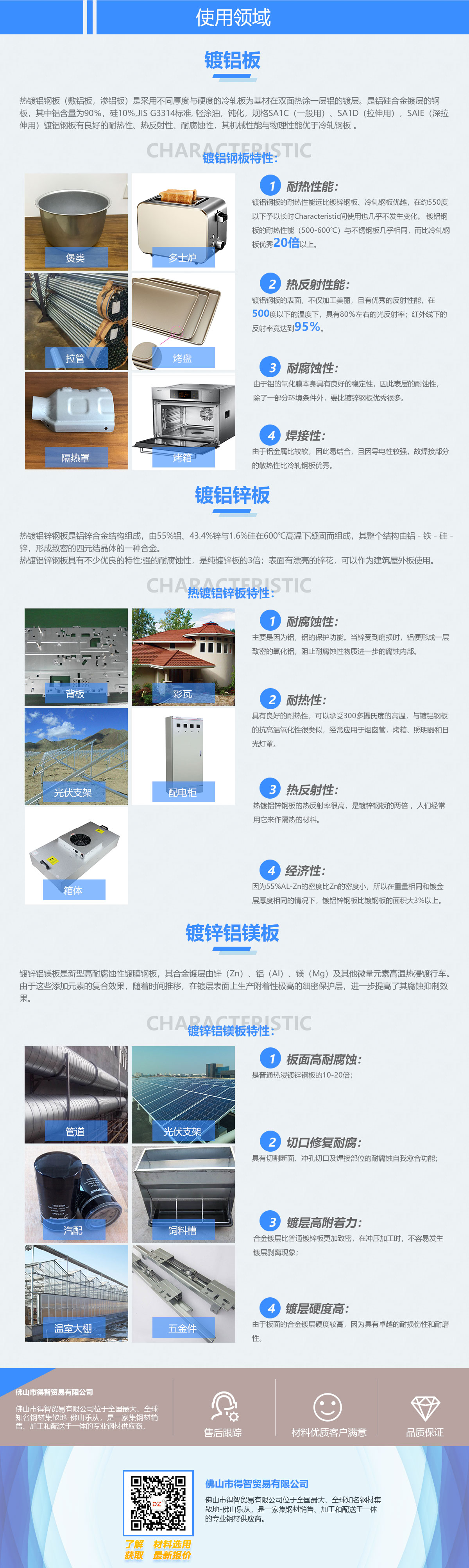 您好!我們是佛山市得智貿(mào)易有限公司,位于佛山樂從—全國最大,全球知名的鋼材集散地!我們長年供應進口及國產(chǎn)鍍鋁鋼板、鍍鋁鋅板、鍍鋅鋁鎂板、高鍍層鍍鋅板等等,是韓國浦項、華菱安賽樂、寶鋼、鞍鋼蒂森以及攀鋼、酒鋼各大品牌的重要代理商。